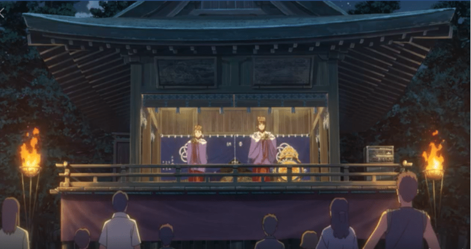 Celebración sintoísta en Itomori (Kagura) Mitsuha danzando en el papel de miko Portal sintoísta donde Mitsuha pide el deseo de cambiar de vida
