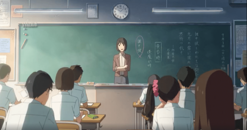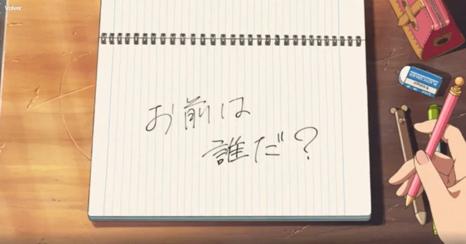 Durante dicha clase, la protagonista parece no prestar atención a la explicación del concepto mencionado porque se distrae cuando ve una nota en su cuaderno que dice: «¿quién eres?», frase que contrasta de forma graciosa y extraña con lo que le dice la profesora cuando la llama para hacerle una pregunta sobre la lección del día: “Veo que hoy si te acuerdas de tu nombre”. Como espectadores, intuimos que esta escena podría ser una prueba más de la extraña conducta que habría tenido la protagonista días atrás, según el testimonio de su familia y sus amigos (Teshigawara y Sayaka), actitudes que no parece recordar; sin embargo, sí declara recordar que siente “como si soñara con la vida de alguien más”, lo que nos lleva a pensar que quizás no recuerda lo sucedido porque en ese momento ella dormía (o “soñaba”) mientras otra persona (Taki) se introducía y tomaba posesión de su cuerpo.