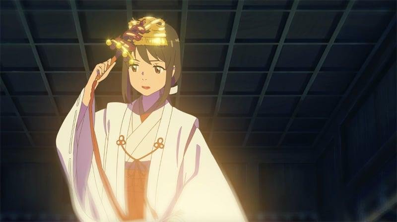 Kagura es una antigua ceremonia teatral japonesa en honor a los dioses de la religión sintoísta. Se celebraba habitualmente en el palacio imperial, y consistía en pasos lentos interpretados por sacerdotes, conjuros y danzas culturales y mitológicas. Mitsuha y su hermana menor asumen el papel de mikos (es decir, de sirvientas de un templo sinto) para ejecutar la danza ceremonial y así proceder también con la preparación del Kuchikamisake, un tipo de alcohol a base de arroz producido por un proceso que involucra saliva humana como iniciador de fermentación. En efecto, las chicas producen la bebida sacra con sus salivas y concluyen la ceremonia.