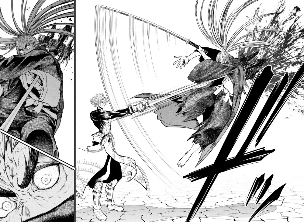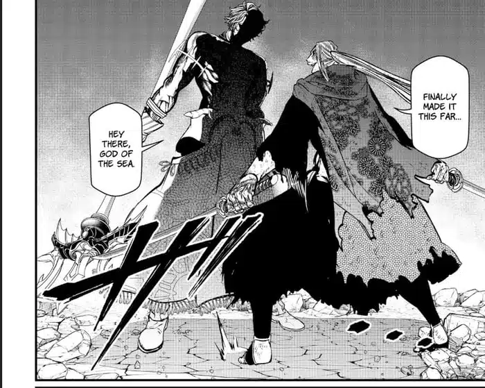 Pero Poseidón decide ser más rápido que el análisis de Kojiro y arremete de tal manera que lo hiere en un costado. El dios de los mares ahora no sólo mira a los ojos a un humano por primera vez, sino que también se dirige hacia Kojiro y se burla de su fallido análisis. La lucha continúa y esta vez Poseidón logra romper la espada de su rival. Con renovadas energías, Kojiro sujeta decidido los dos pedazos de su espada. La dualidad de la valkiria Hrist permite que aparezcan dos espadas. La lucha se reinicia y Sasaki usa todas las técnicas aprendidas en su derrotas. El cuerpo de Poseidón presenta cada vez más cortes y el suelo bajo sus pies se mancha de sangre.