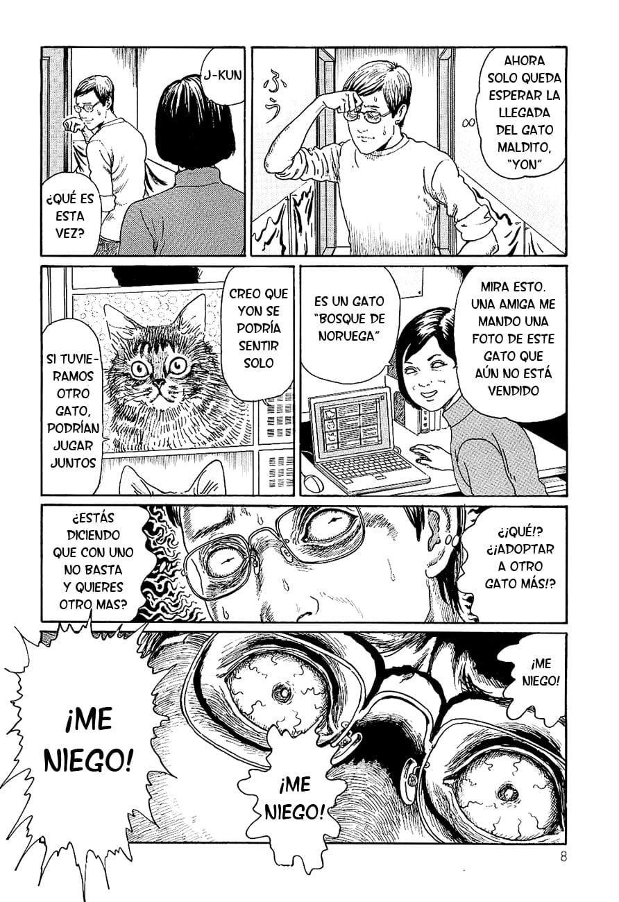Traducido como El diario gatuno de Junji Ito, en general, este manga no presenta complejidad alguna; solo relatos autoconclusivos sobre la crianza de gatos, que serán más del gusto de los dueños de estas mascotas. Sin embargo, más allá del argumento resulta interesante observar cómo el estilo de dibujo y las mismas expresiones venosas y exageradas utilizadas para el horror se adaptan al  género de la comedia y del slice of life, sin apartarnos del ambiente familiar en el que se insertan. Incluso muestras de inclinación a lo monstruoso, como las transformaciones del gato Yon, terminan conformando gags refrescantes y divertidos. Si consideramos la invención como un redescubrimiento, puede considerarse que su brillantez radica en el recordatorio de la maleabilidad de ciertos procedimientos gráficos y en que la obtención del efecto deseado con estos depende de una correcta contextualización.