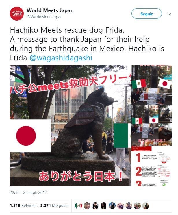 “Hachiko conoce al perro rescatista Frida. Un mensaje de agradecimiento a Japón por la ayuda durante el terremoto en México. Hachiko es Frida”, es el mensaje compartido por la cuenta Twitter de World Meets Japan, el cual tiene ya más de 1300 ‘retweets’ y 2074 ‘me gusta’.