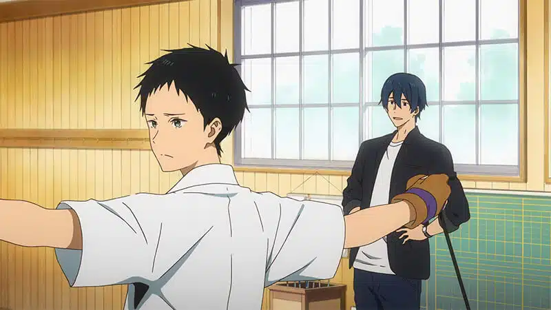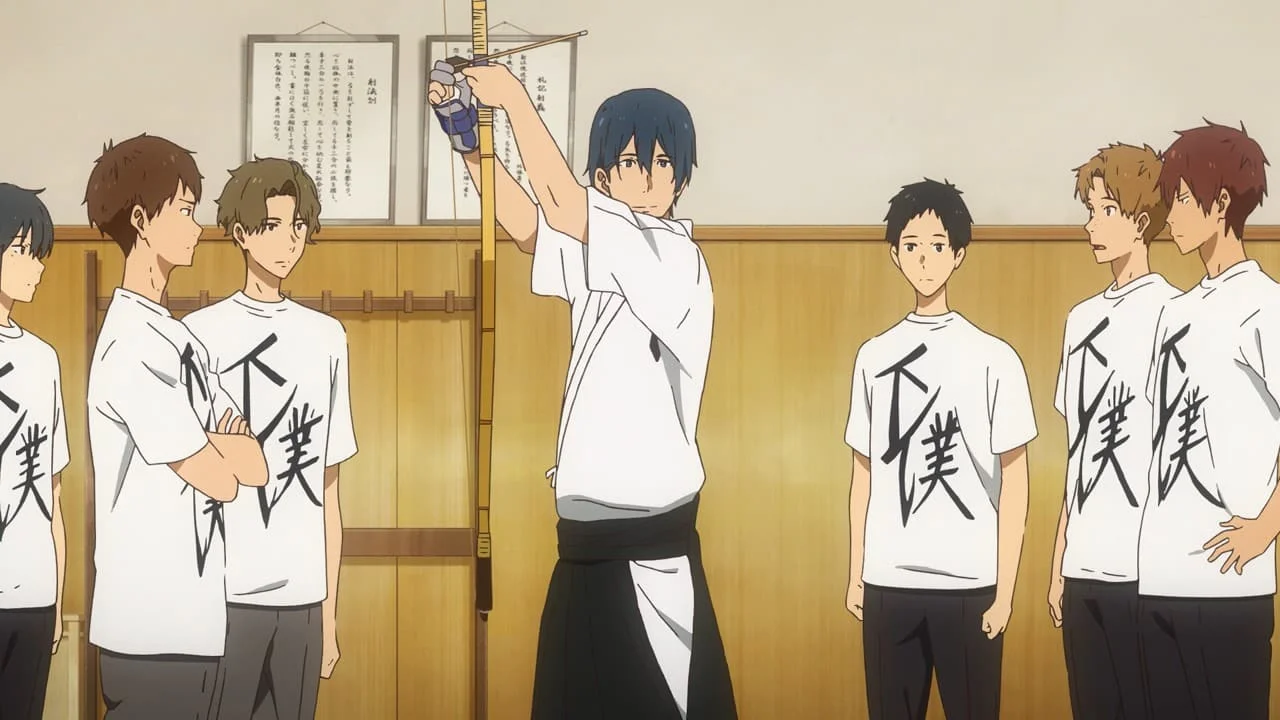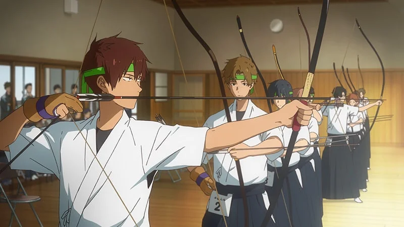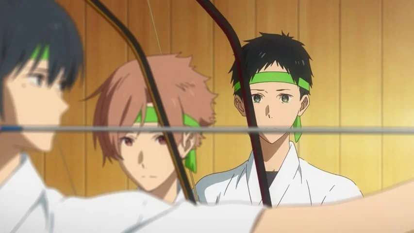 El rival y amigo de Minato, Fujiwara Shuu, le menciona una vez que el kyūdō es algo que haces solo y no algo que haces por otros. Si extrapolamos esa idea, Shuu postula que el camino del arco en el que uno busca conocerse, alcanzar la verdad de uno mismo (shin) se emprende y se transita en solitario, lo que tiene sentido si se considera el nivel de meditación e introspección que compone este arte marcial como filosofía y la voluntad necesaria que se requiere para enfrentar todo ello. Incluso, cuando realicé la investigación para escribir este artículo, no había casi ninguna mención a los equipos de kyūdō, sino que siempre se centraban en describirlo desde la experiencia individual. Cuando se referían al colectivo era para mencionar cómo debe haber una armonía en el conjunto cuando se realizan las posiciones y posturas de los arqueros en un evento de competencia individual o que, debido al perfeccionamiento del carácter que promueve el tiro con arco japonés, se promueve la armonía entendida como paz social. No obstante, me llamó la atención la cita a una acción tan pequeña y cotidiana como el apoyo que necesita un kyūdōjin de otro para poder tensar la cuerda de su arco por el tamaño del mismo. La serie sigue esta línea.